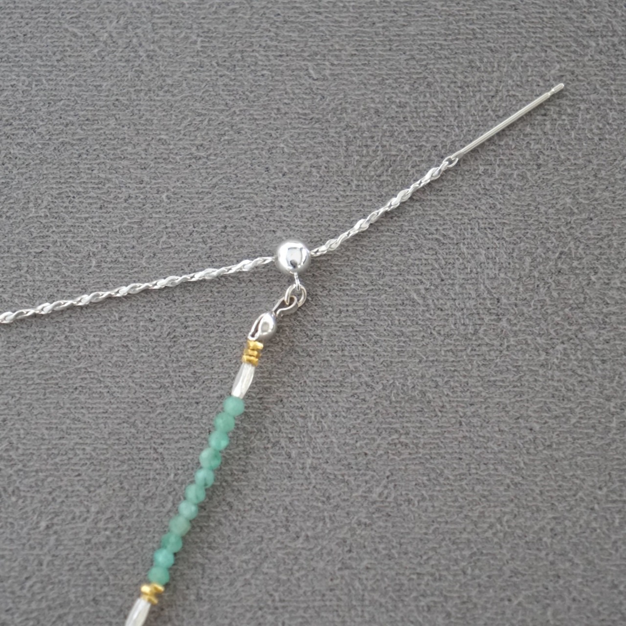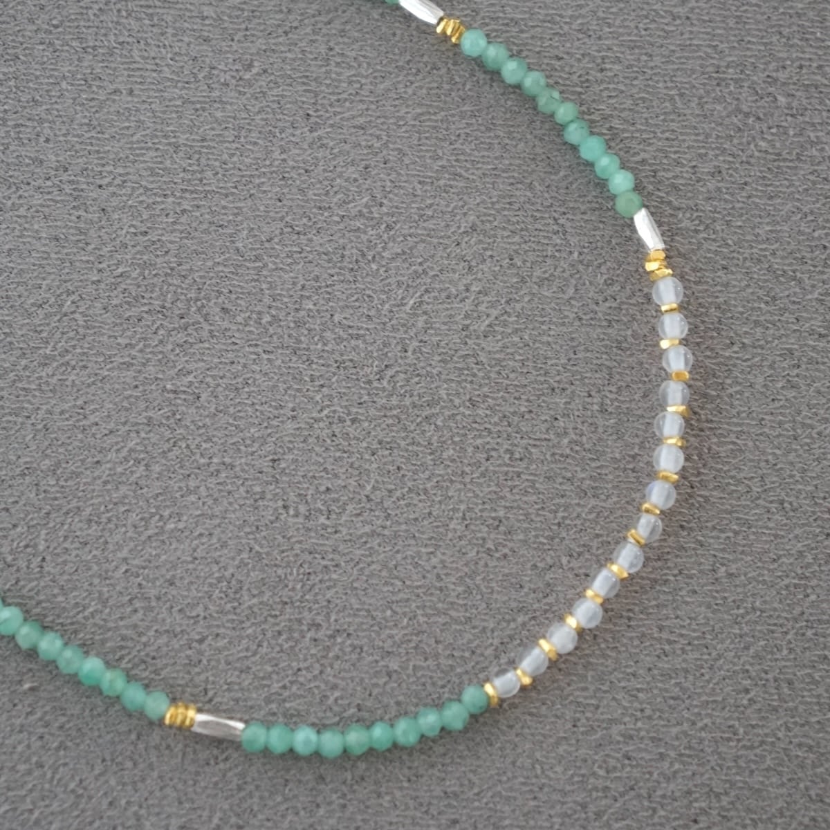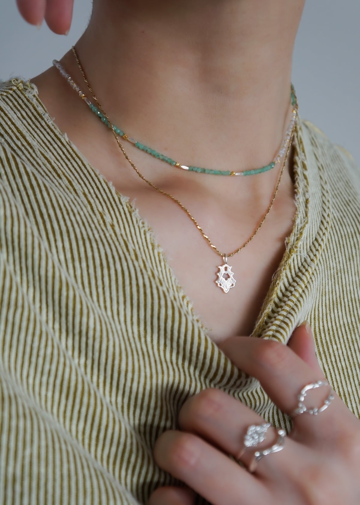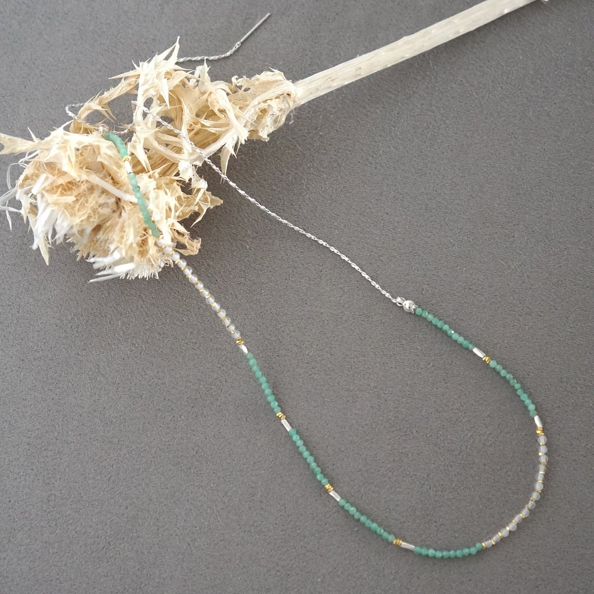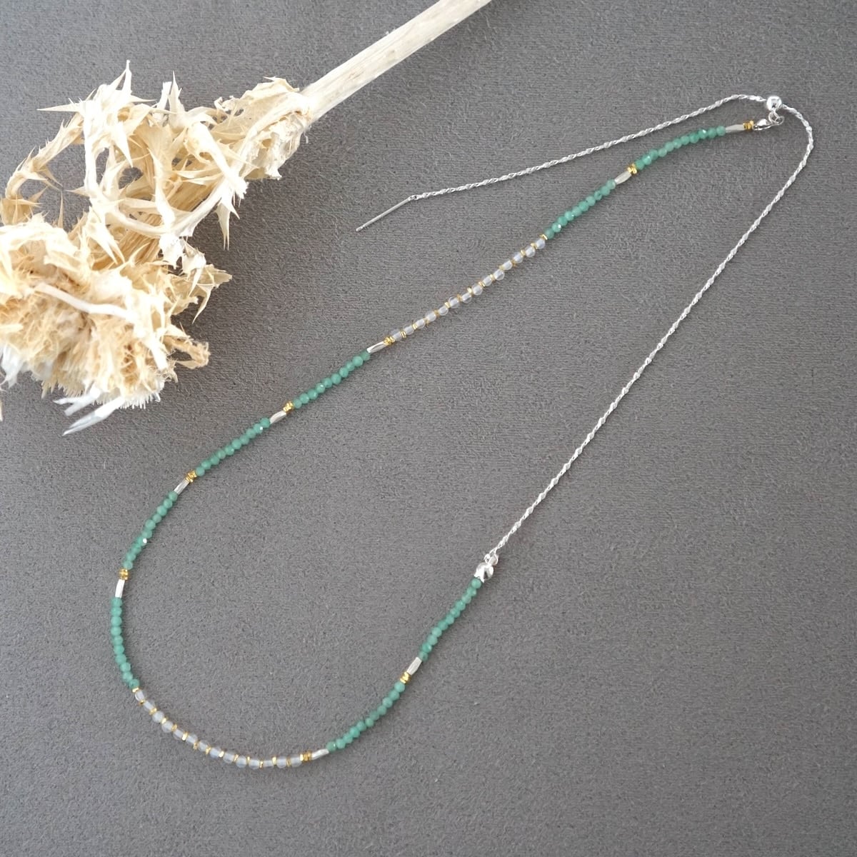 天然石ビーズは小粒のため、ネックレスの重ね着けにもおすすめです。