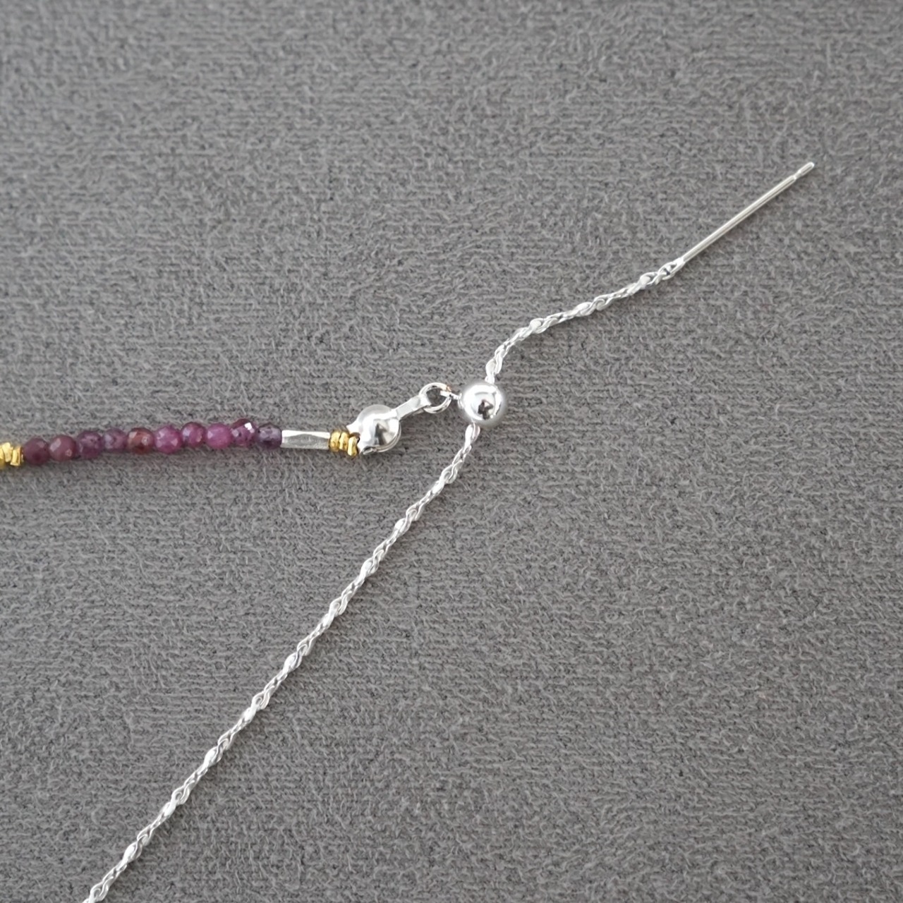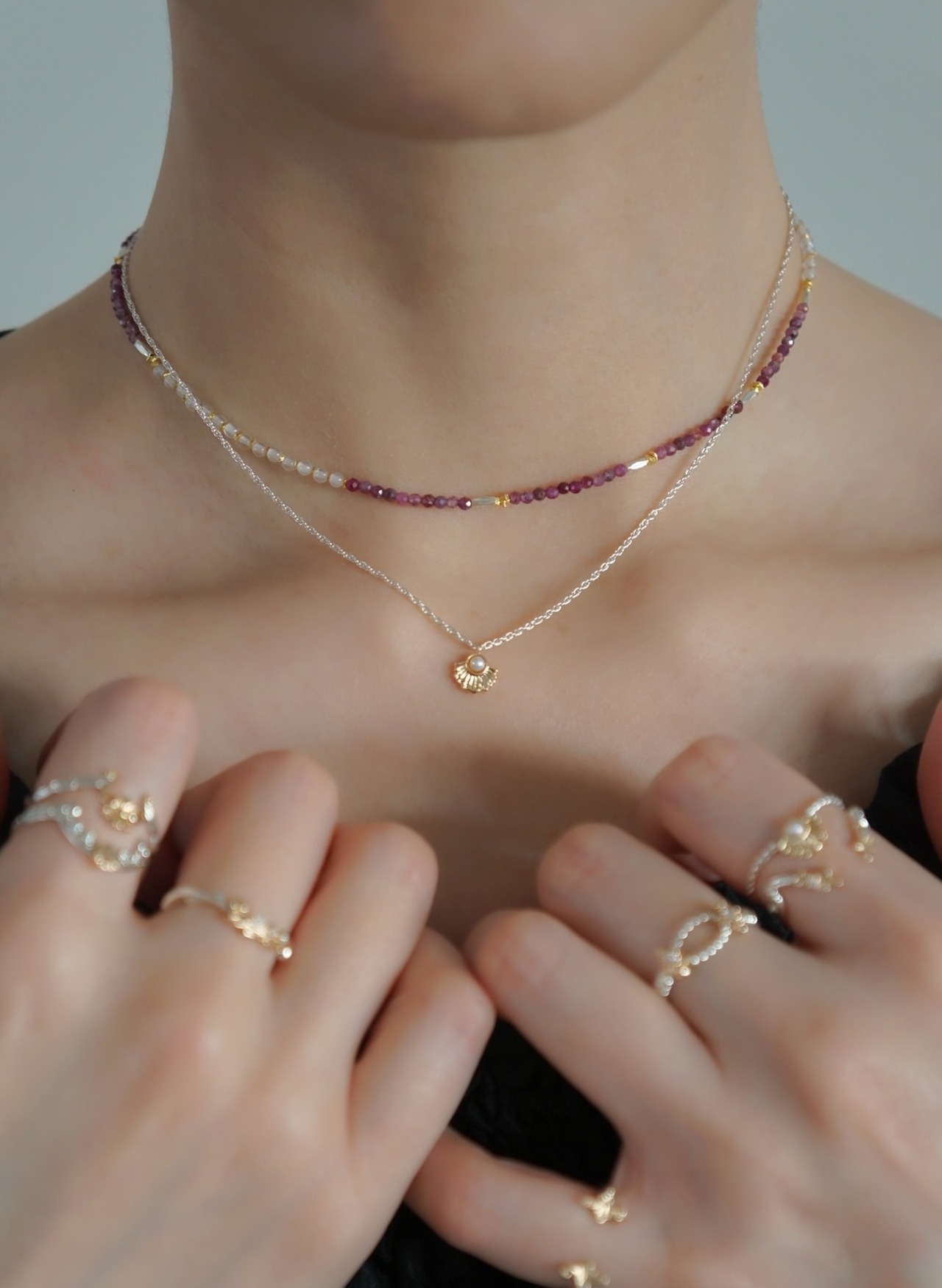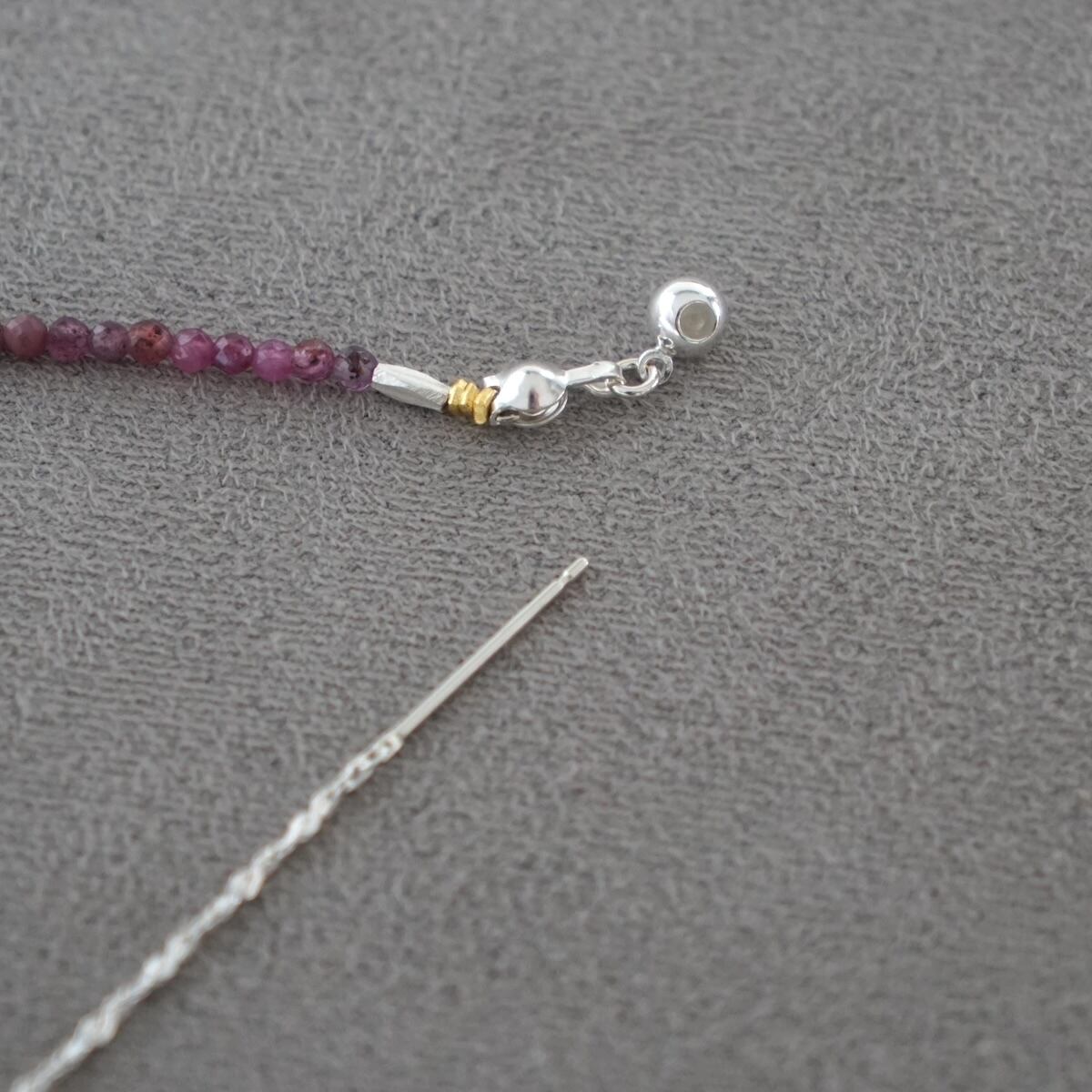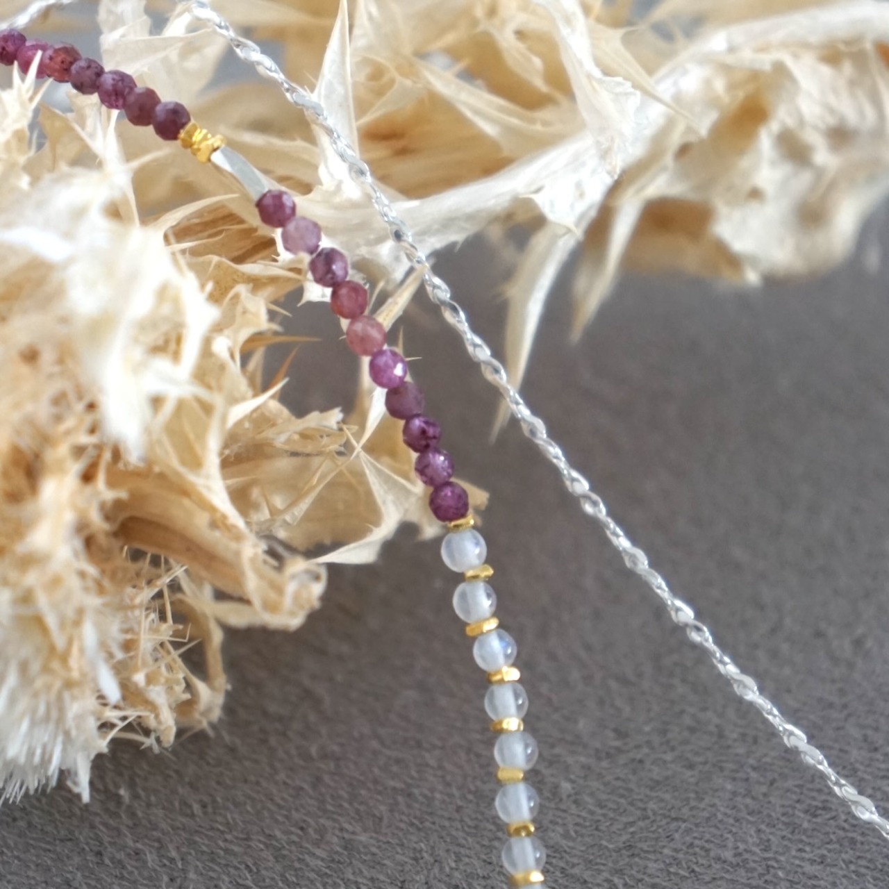 天然石ビーズは小粒のため、ネックレスの重ね着けにもおすすめです。