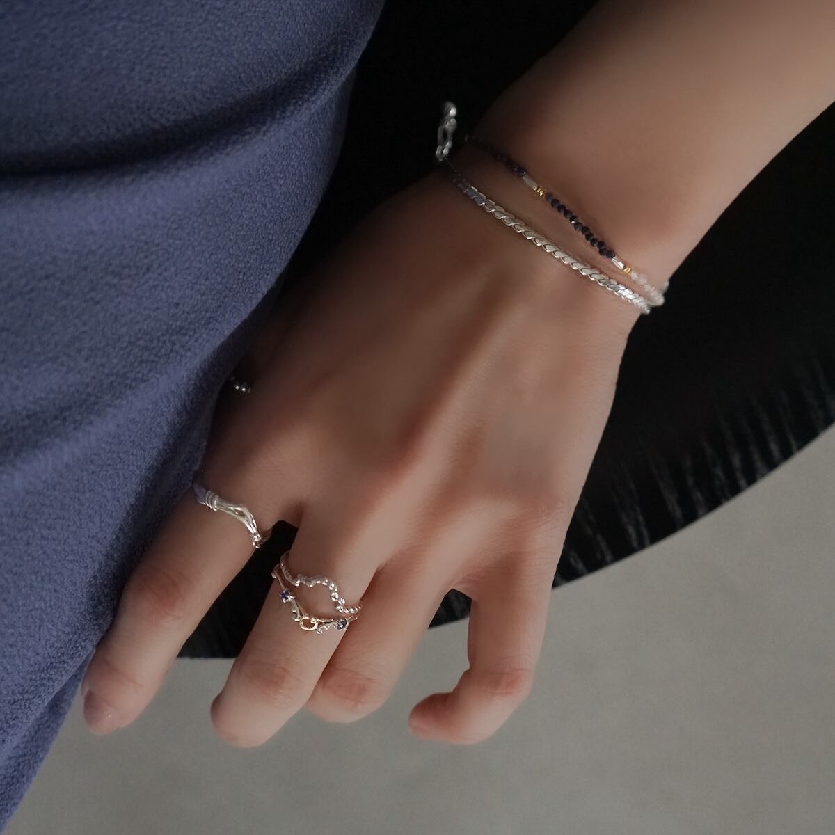 silverチェーンを合わせた手元を明るく彩る一品です。