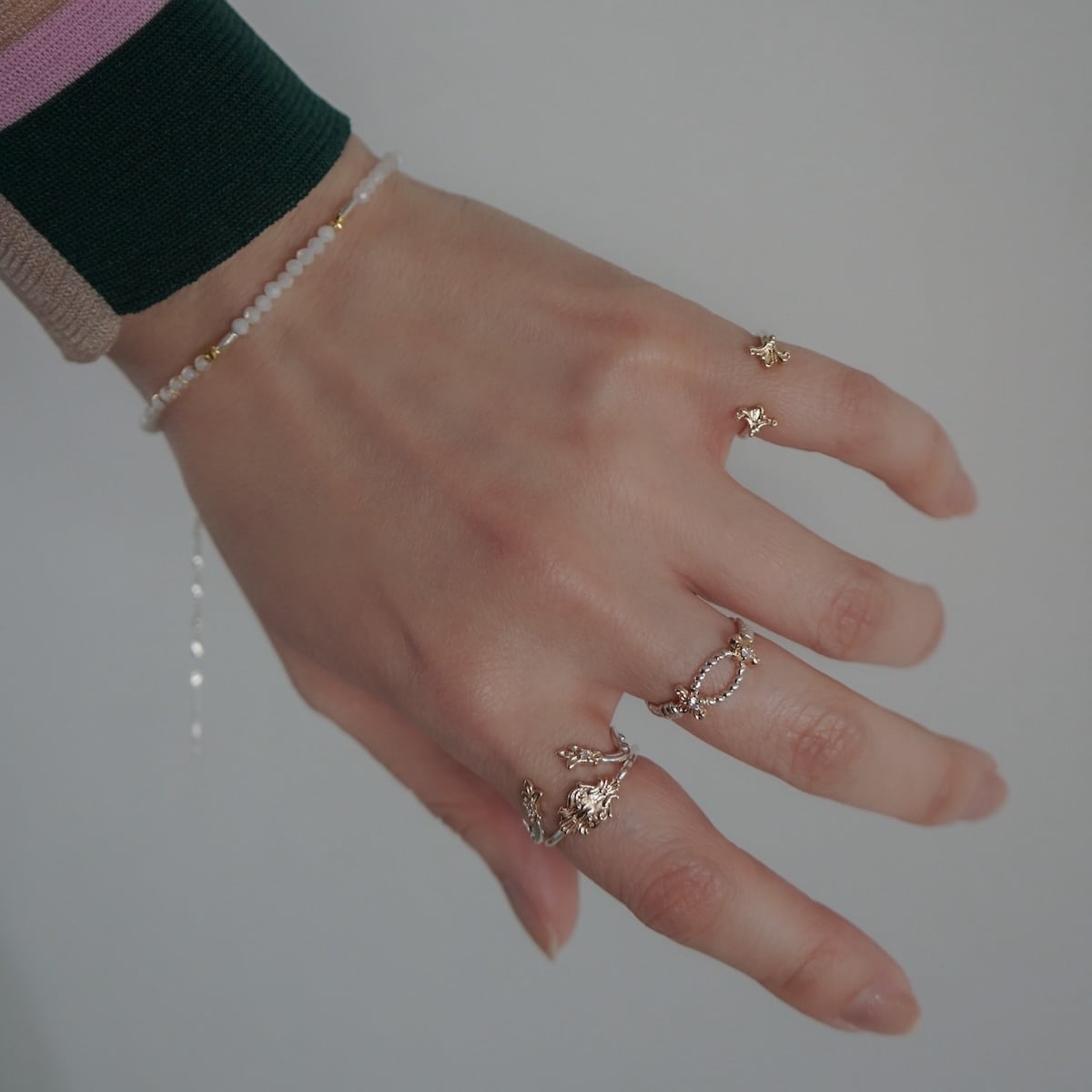 silverチェーンを合わせたを合わせた手元を明るく彩る一品です。