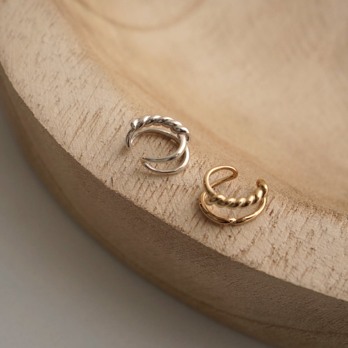 程よいボリューム感で耳周りを飾る2連のイヤーカフ。